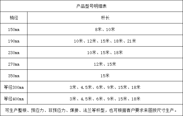 恒力通生產(chǎn)的電線桿有:8米電線桿(預(yù)應(yīng)力)、9米電線桿(預(yù)應(yīng)力)、10米電線桿(預(yù)應(yīng)力)、12米電線桿(預(yù)應(yīng)力)、15米電線桿(預(yù)應(yīng)力)、18米電線桿(預(yù)應(yīng)力)、10米電線桿(非預(yù)應(yīng)力)、12米電線桿(非預(yù)應(yīng)力)、15米電線桿(非預(yù)應(yīng)力)以及18米電線桿(非預(yù)應(yīng)力)等等不同規(guī)格以及類型的水泥電線桿。
